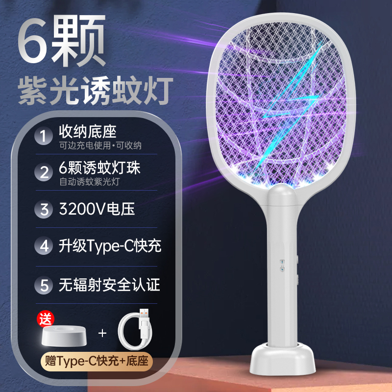 电蚊拍充电式家用强力灭蚊拍灭蚊灯二合一电苍蝇电蚊拍打蚊子神器 月光白小牛32006灯变频自动诱蚊+Type-C快充+可收纳