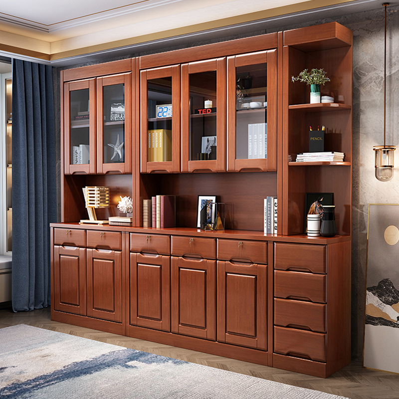 青木川中式实木书柜书架落地靠墙客厅卧室带玻璃门防尘收纳储物柜置物架 胡桃色 海棠色 五门+边柜【232x40x200cm】