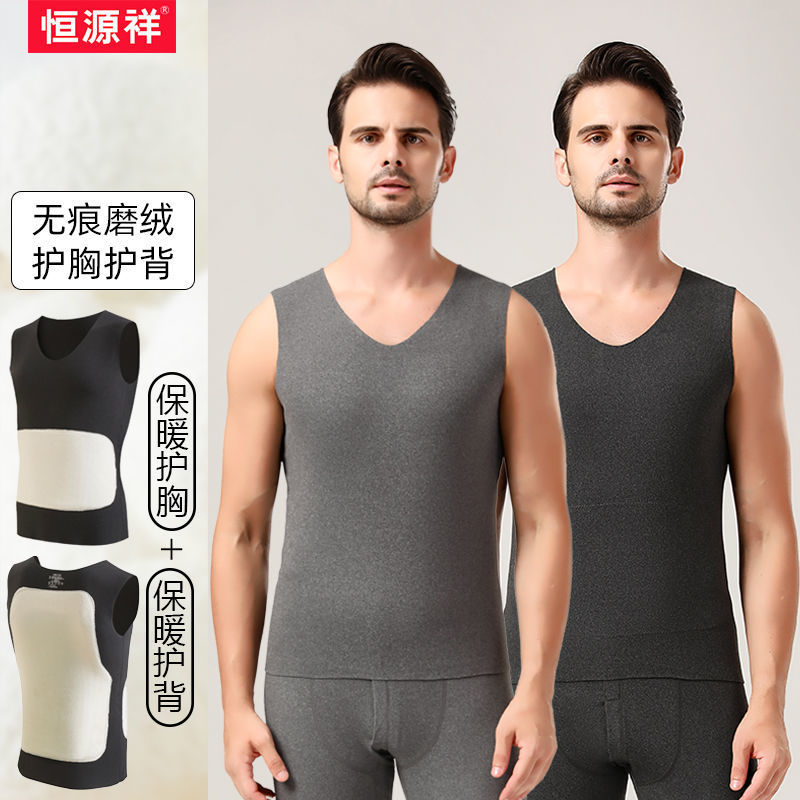 恒源祥男士保暖背心无痕加厚马甲加绒德坎肩打底衫内穿秋冬季 190 2件装-深灰+浅灰-保暖护胸护背
