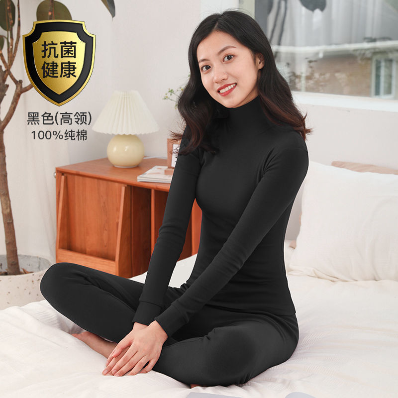 恒源祥女士保暖内衣纯棉毛衫薄款透气全棉秋衣秋裤套装秋冬季_213 170/L 女高领-黑色