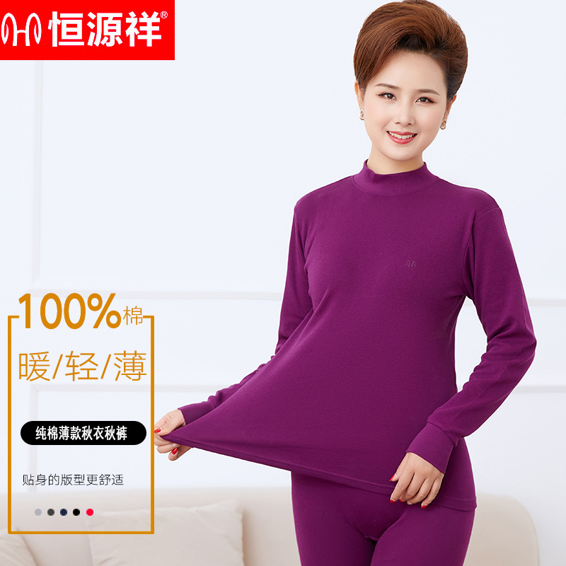 恒源祥秋衣秋裤纯棉薄款中高领男女保暖内衣套装中老年_63 165/90 紫色女