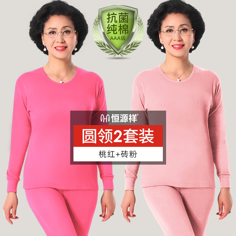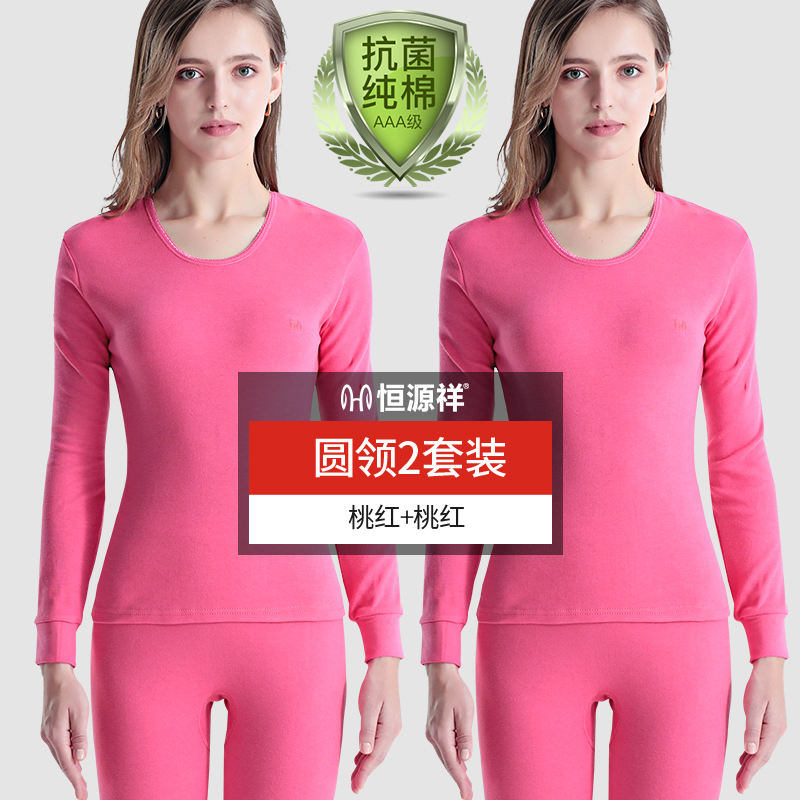 恒源祥纯棉女士保暖内衣套装中老年人秋衣裤冬季薄款秋裤全棉毛衫_963_336 180/2XL AAA抗菌【圆领】桃红+砖粉
