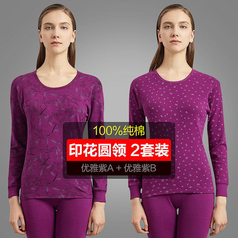 恒源祥秋衣秋裤女士纯棉薄款内穿紧身打底全棉毛衫保暖内衣套装冬_591 170/XL【闪电发货365天质保】 印花圆领(优雅紫A+优雅紫B)