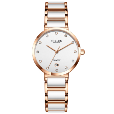 梭伦(SOLLEN)手表陶瓷轻奢小众名牌ins风简约学生女士时尚休闲潮流防水韩版简约石英表女表新款SL-407 镶钻玫瑰金