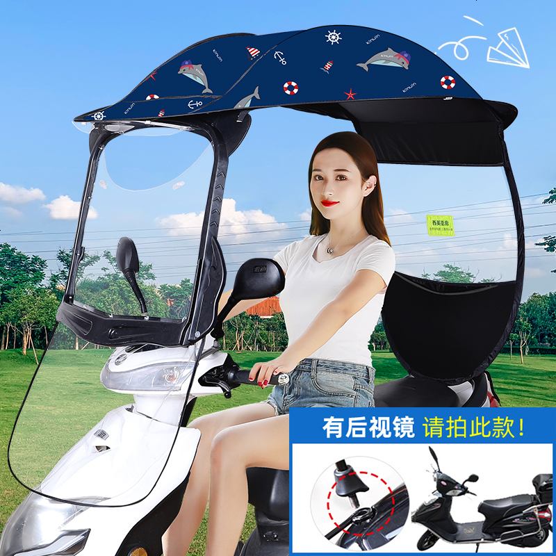 电动摩托车挡雨棚篷蓬电瓶车遮阳雨伞防雨防晒挡风罩加厚车棚新款_129_576 爱心棚-藏青海豚-有后视镜车拍