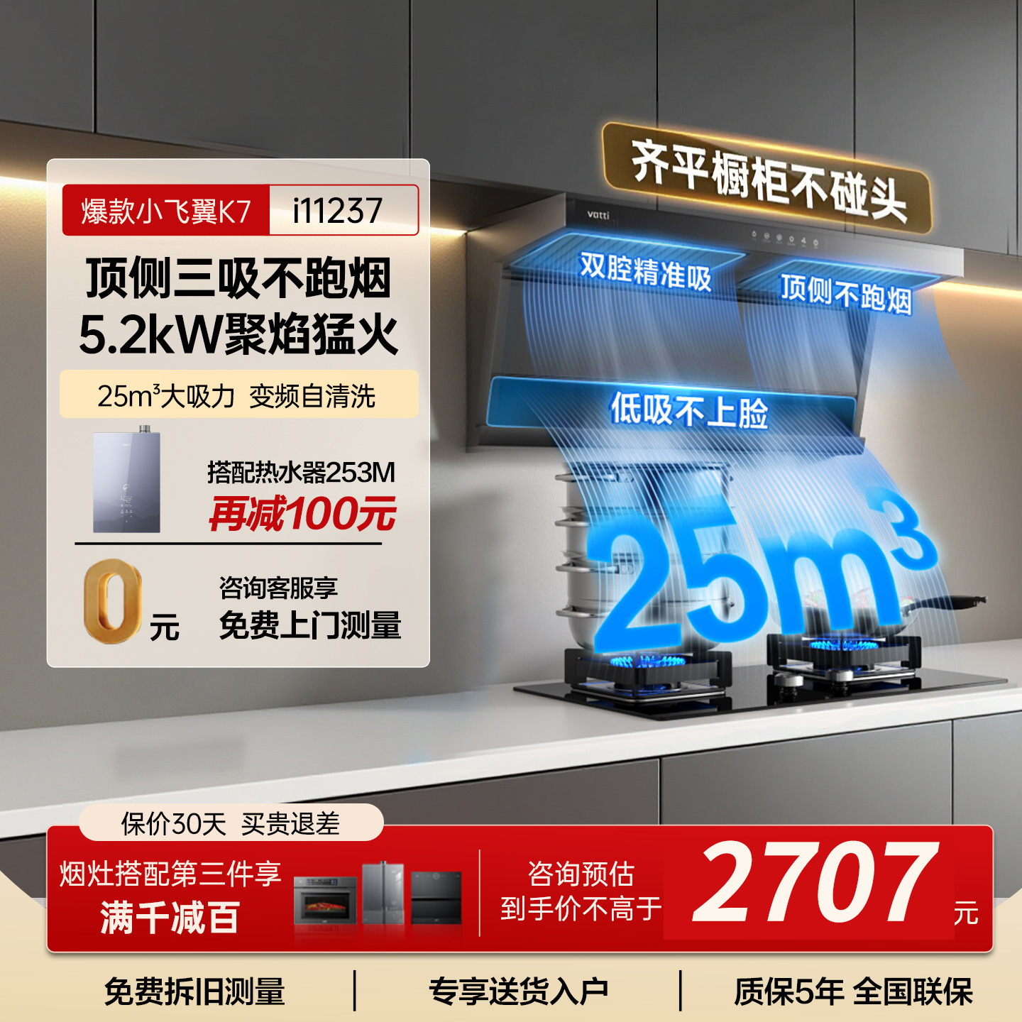 [烟灶套装]华帝小飞翼顶侧三吸 变频25风量 烟灶套餐i11237+i10071B大吸力抽油烟机K7 5.2kw灶