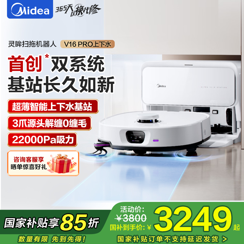 美的(Midea)V16 Pro超薄自动上下水扫地机器人 家用扫拖一体免维护自动清洗拖地智能擦地机