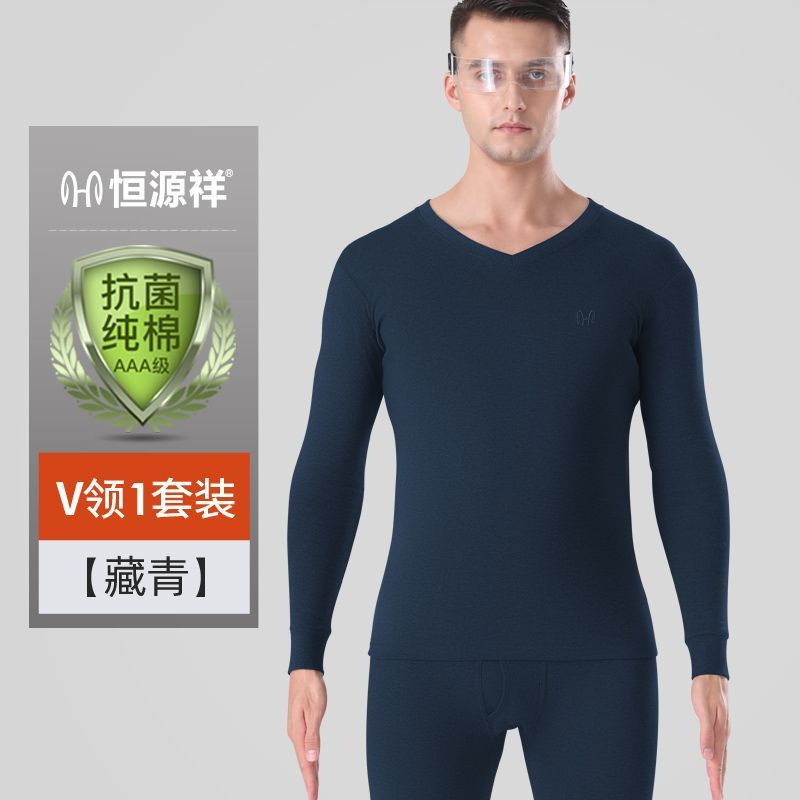 恒源祥男士纯棉毛衫秋衣单件上衣中高领保暖大码内衣套装男秋冬季_192 170/L 上衣套装【纯棉V领】藏青