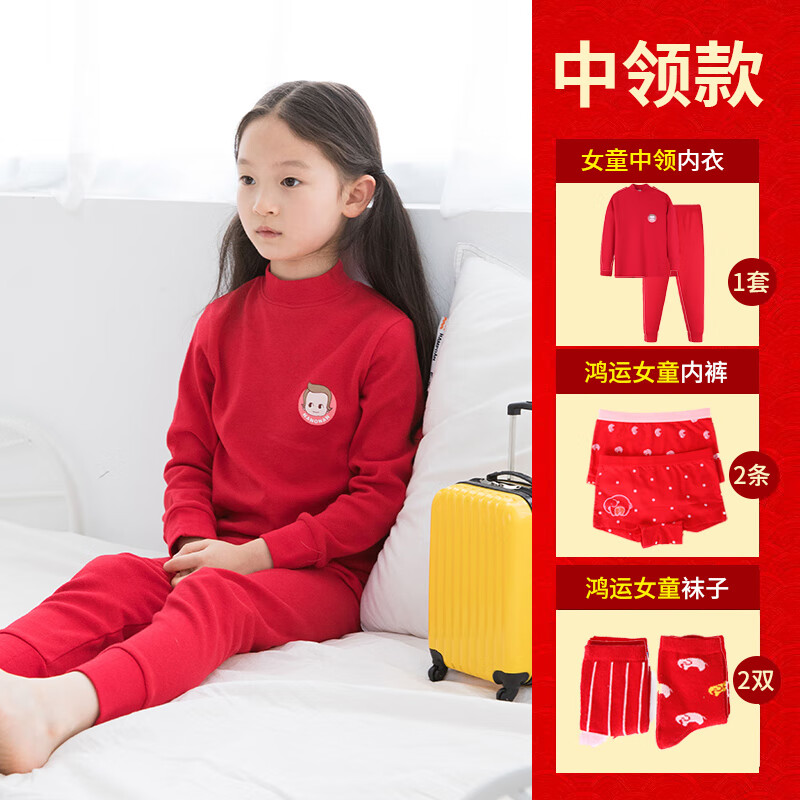 恒源祥儿童加绒加厚大红纯棉保暖内衣套装男童女童本命年秋衣秋裤_248 140cm(高125-134,重55-65斤) 【女童纯棉款】中领1套内衣+2内