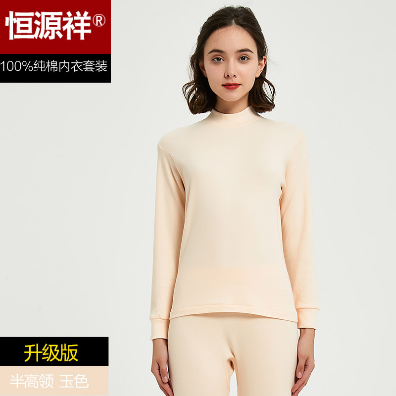 恒源祥女士秋衣秋裤纯棉半高领棉毛衫青年棉保暖内衣薄款套装秋_928_100 175/XL 女士纯棉半高领肤色