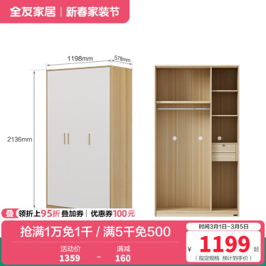 全友家居北欧现代三门衣柜 清新木纹带L灯储物收纳衣橱卧室整体家具 【腊木木纹A款】三门衣柜
