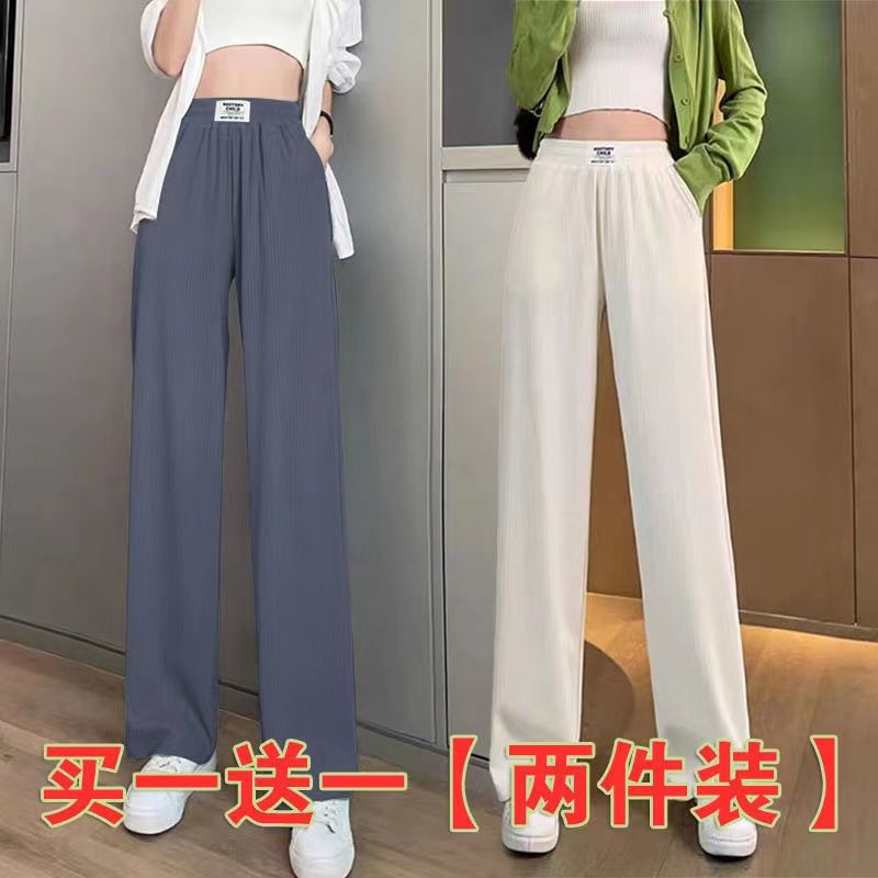 绿色冰丝阔腿裤女夏季薄款高腰显瘦垂感直筒休闲拖地裤 L【100-120斤】 灰色+杏色【两条实惠装】