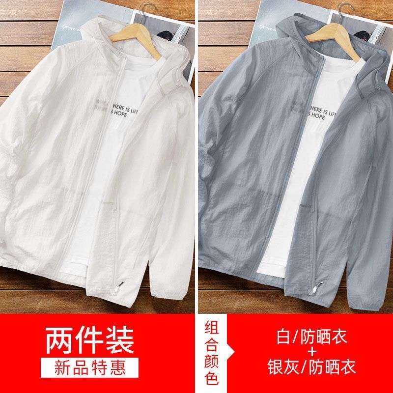 衣男夏季冰丝透气轻薄凉感宽松潮流休闲服男薄款夹克外套 4XL170-200 【两件装】防晒衣-白色+银灰