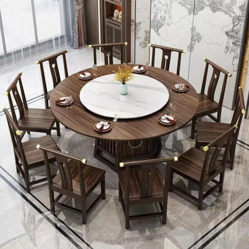 青木川 新中式实木餐桌椅组合套装客厅家用大小户型别墅农村1.3米1.4m大圆桌转盘8-10人圆形吃饭桌子带转盘餐台 乌金色 1.3米直径圆桌+六椅
