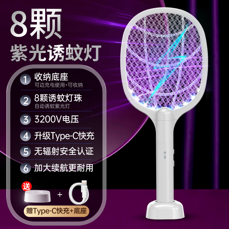 电蚊拍充电式家用强力灭蚊拍灭蚊灯二合一电苍蝇电蚊拍打蚊子神器 月光白小牛32008灯变频自动诱蚊+Type-C快充超长续航