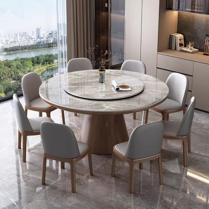 青木川 简约现代实木餐桌椅组合客厅餐厅家用小户型带转盘圆桌微晶石圆形吃饭桌子 胡桃色 1.3米圆桌+6张八角椅