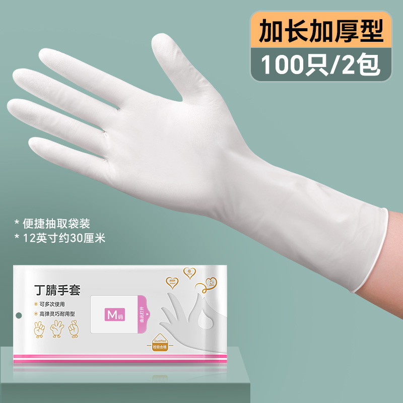 丁腈手套加长耐用一次性洗碗加厚防油橡胶劳保家务厨房清洁做饭套 12寸玉石白加长加厚100只(2包50只)升级便携装 L