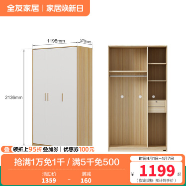全友家居北欧现代三门衣柜 清新木纹带L灯储物收纳衣橱卧室整体家具 【腊木木纹A款】三门衣柜