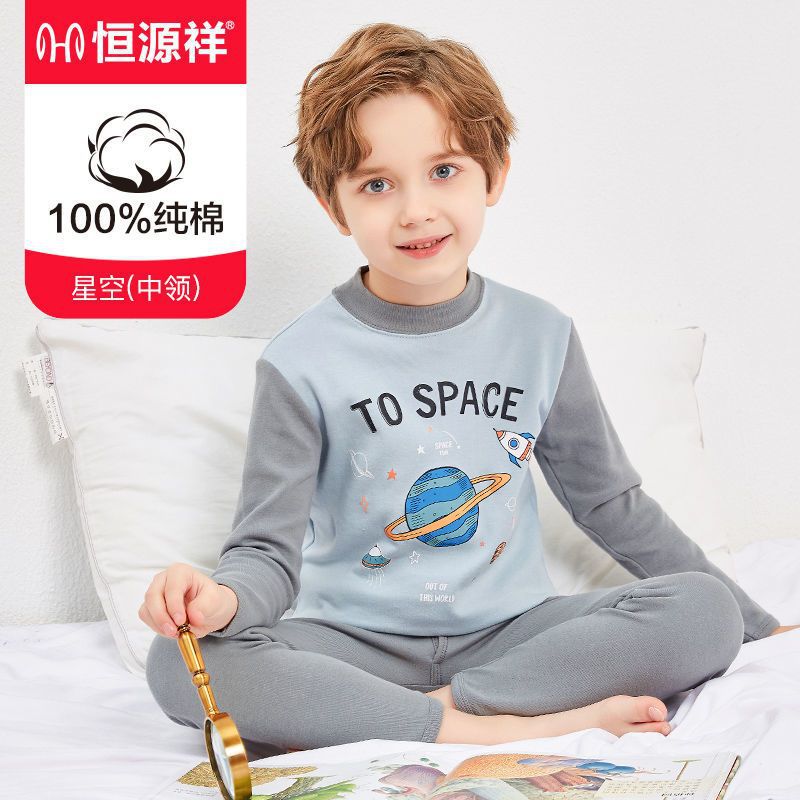 恒源祥儿童纯棉秋衣秋裤套装男童大童线衣棉女童男宝宝保暖内衣_623_129 推荐155-165CM/72-80斤 【星空】中领套装