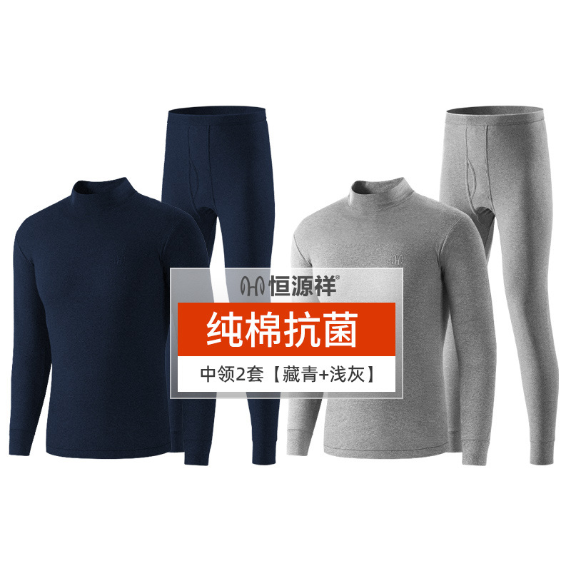 恒源祥保暖内衣男士纯棉秋冬季秋衣秋裤套装男圆领打底衫棉毛衫_470_768 170/L【推荐体重110-130斤】 2套中领【纯棉抗菌】藏青+浅灰