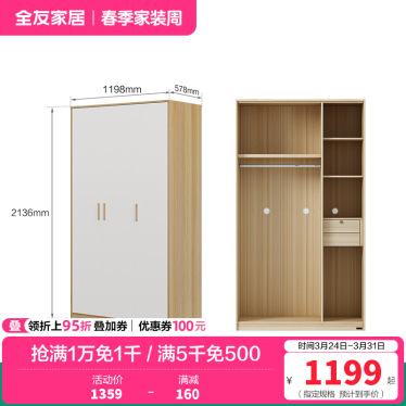 全友家居北欧现代三门衣柜 清新木纹带L灯储物收纳衣橱卧室整体家具 【腊木木纹A款】三门衣柜