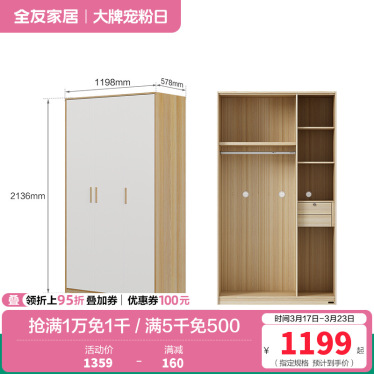 全友家居北欧现代三门衣柜 清新木纹带L灯储物收纳衣橱卧室整体家具 【腊木木纹A款】三门衣柜