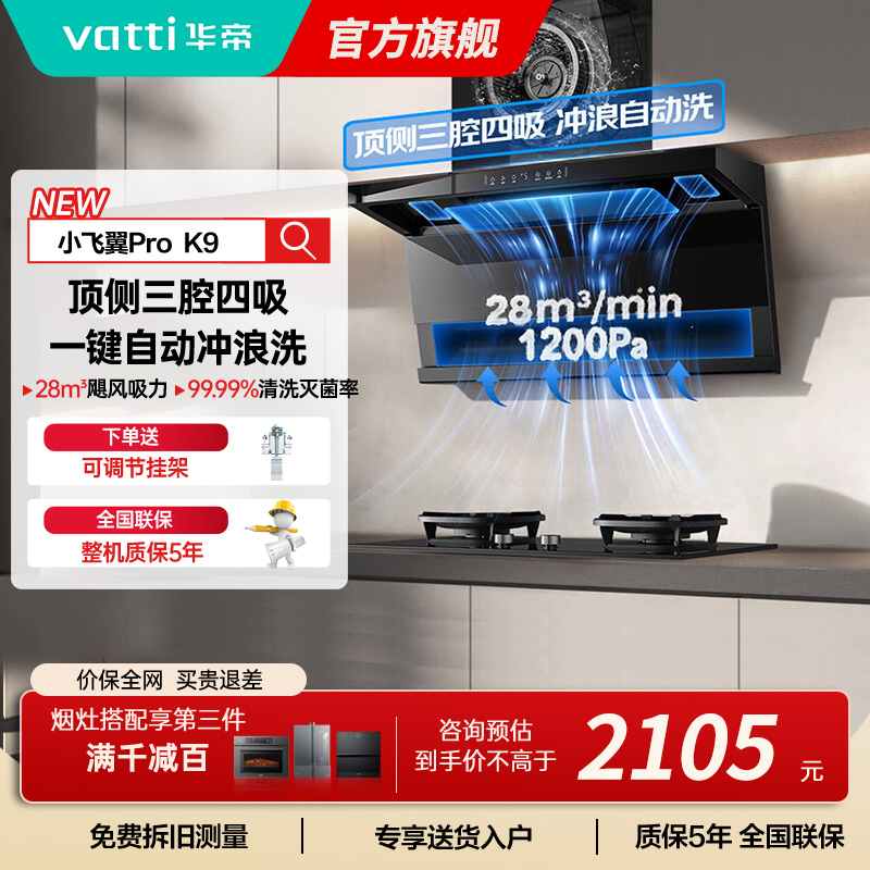 华帝(vatti)[小飞翼Pro K9]小飞碟28风量大吸力脱排油烟机 i111K9超薄平嵌7字型变频顶侧双吸三腔自动洗