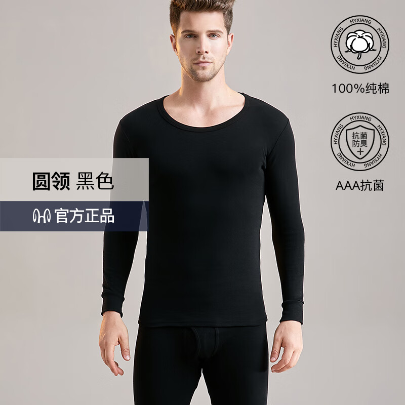 恒源祥保暖内衣男士纯棉毛衫青少年全棉薄款打底秋衣秋裤套装高领_30_432 否x180(2XL)【闪电发货,30天 纯棉【圆领】黑色