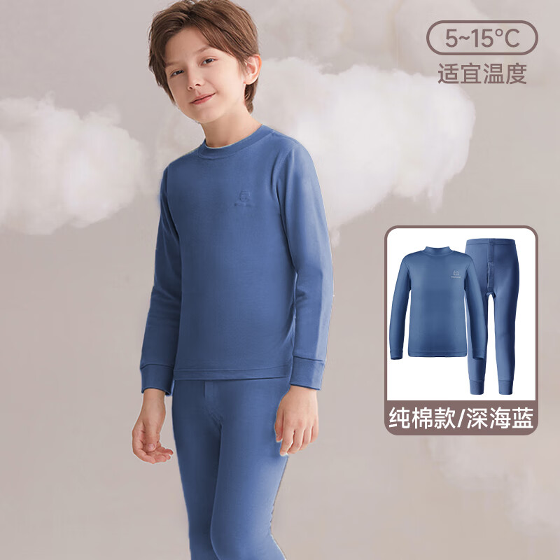恒源祥儿童保暖内衣套装男童秋衣秋裤纯棉女童线衣裤德绒A类全棉_112_106 170cm【160-170cm,85-100斤】 【纯棉款】中领-深海蓝【男童】
