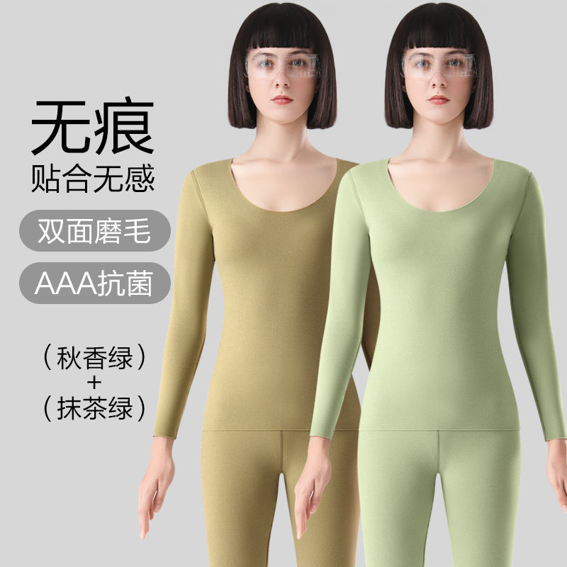 恒源祥薄款保暖内衣女士无痕轻薄紧身打底内穿秋衣秋裤套装秋冬季_71_844 165/90 【双面磨毛】抹茶绿+秋香绿