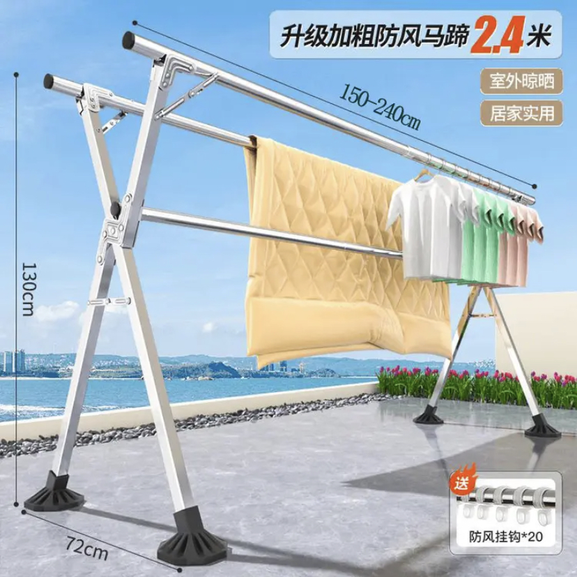 免安装可折叠晾衣架落地家用阳台立式伸缩双杆简易晾衣架挂衣架子 三杆大脚伸缩1.5-2.4m送防风扣