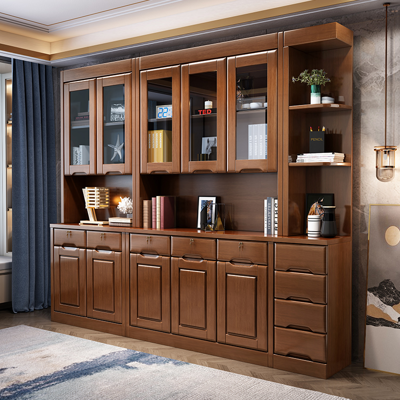 青木川中式实木书柜书架落地靠墙客厅卧室带玻璃门防尘收纳储物柜置物架 胡桃色 胡桃色 两门+边柜【112x40x200cm】