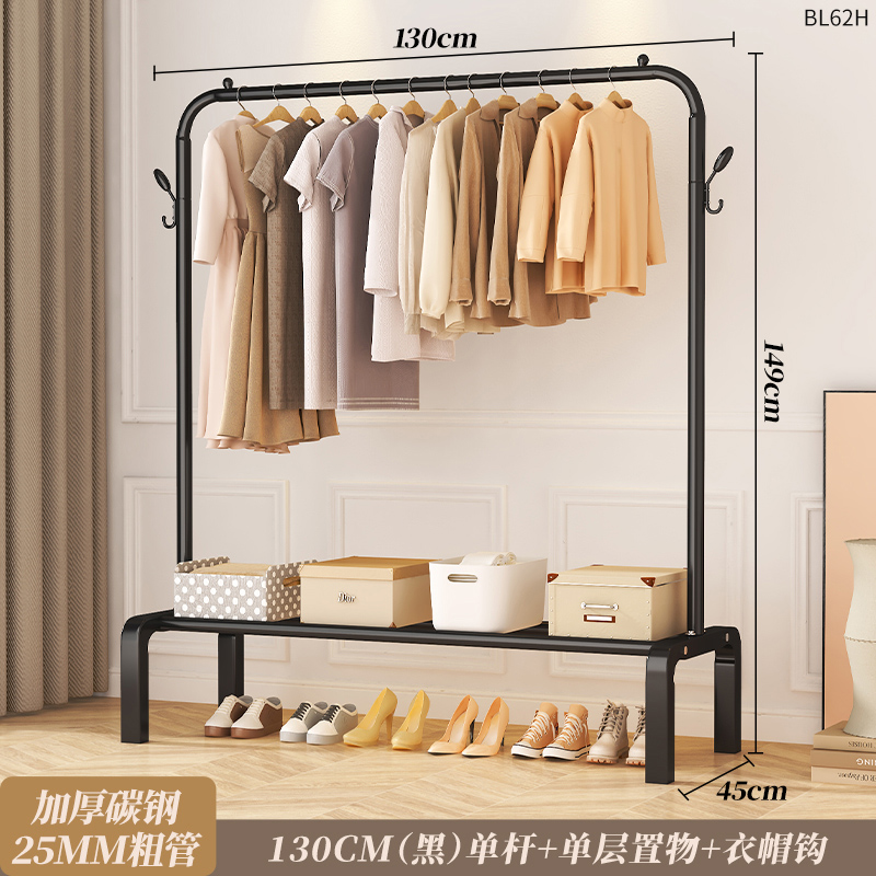 晾衣架落地室内家用衣服架子双杆置物架可移动衣帽架晒衣杆神器 25圆管碳钢黑单杆130cm+2钩