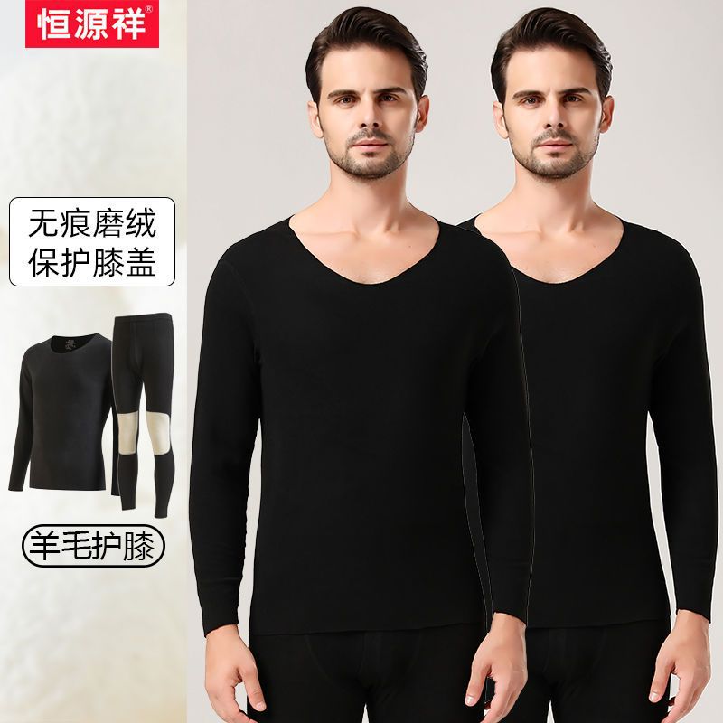 恒源祥无痕保暖内衣套装男士加绒德护膝发热秋衣秋裤青年打底秋冬_742_828 175(XL) 男2套-黑色+黑色-无痕磨绒羊毛护膝