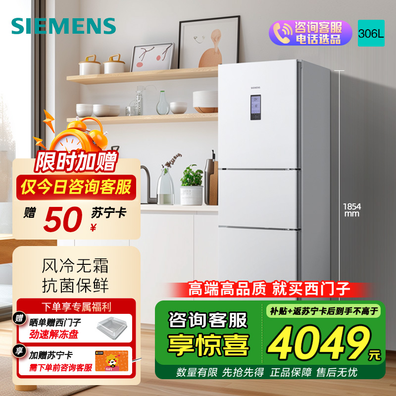 西门子 306升大容量三门冰箱小户型家用 风冷无霜 控湿保鲜 智能速冷速冻 (白色) 支持国家补贴 KG32HA22EC
