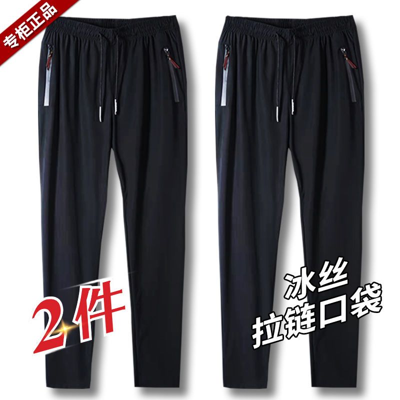 夏季薄款冰丝长裤男士运动裤直筒空调裤宽松弹力休闲裤速干裤子男_1 3XL【140-160斤】 富贵【黑色+黑色】2件装