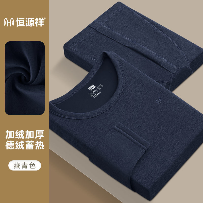 恒源祥男士保暖内衣男加绒加厚青年打底套装棉毛衫秋衣秋裤男冬季_71 180/2XL 套装加绒加厚圈领藏青