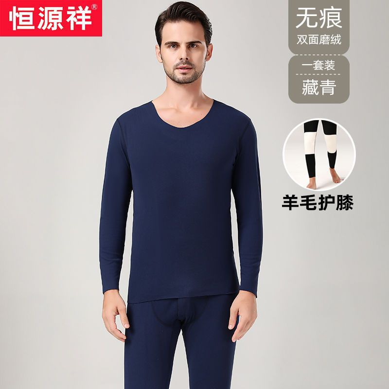 恒源祥无痕保暖内衣套装男士加绒德护膝发热秋衣秋裤青年打底秋冬_742_828 165(M) 男1套-藏青-无痕磨绒羊毛护膝