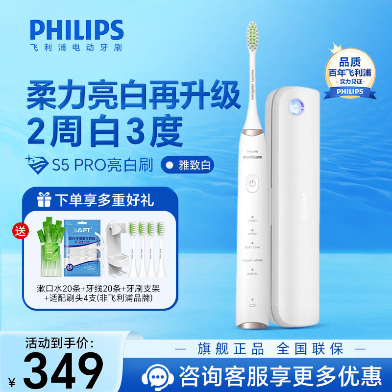 飞利浦(PHILIPS)电动牙刷 亮白机皇成人声波震动牙刷 成人男士女士圣诞节礼物送男友女友白色 HX2481/01