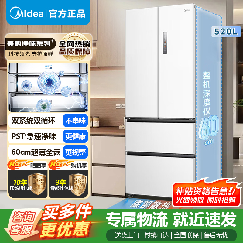 美的M60系列520升法式多门冰箱四开门双系统双循环底部散热薄零嵌除菌净味大容量电冰箱BCD-520WUFPZM(E)