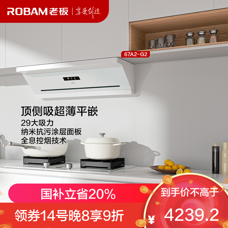 老板(Robam)油烟机67A2 懒人油烟机国家补贴20%顶侧吸超薄平嵌 智能29大吸力 顶侧一体白色67A2-G2