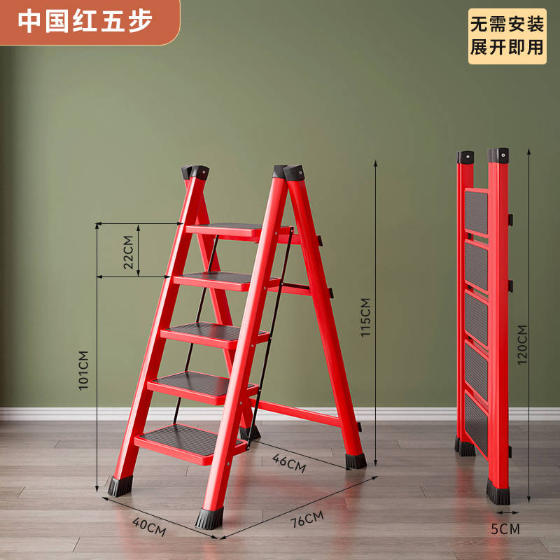 梯子家用折叠多功能伸缩加厚室内人字梯步梯楼梯小型便携四步登高 加厚碳钢五步梯中国红带安全卡扣平头