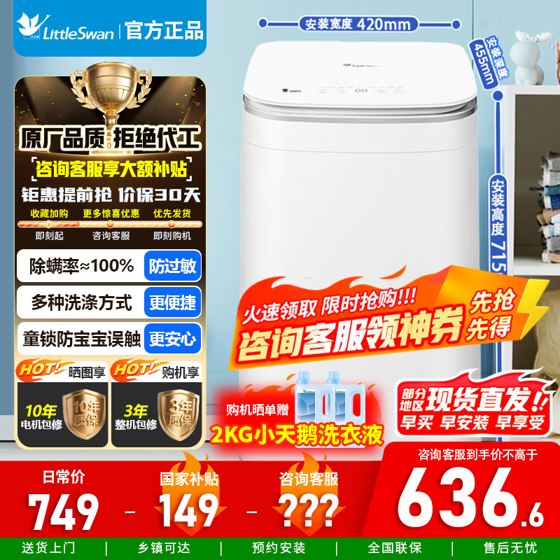 [官方正品]小天鹅波轮洗衣机全自动 3KG迷你洗衣机婴儿内衣洗衣机健康除螨洗高温加热 TB30VH80EPLUS