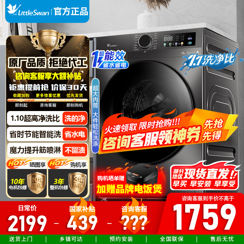[官方正品]小天鹅洗衣机12kg大容量滚筒家用超薄全自动洗烘一体1.1洗净比节能除菌除螨TD120V098WDT