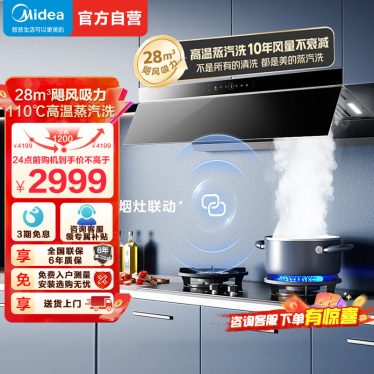 [高温蒸汽洗]美的(Midea)AK7Pro升级款顶侧一体跨界双腔 烟灶联动28m³大吸力 变频巡航 超薄近吸抽油烟机