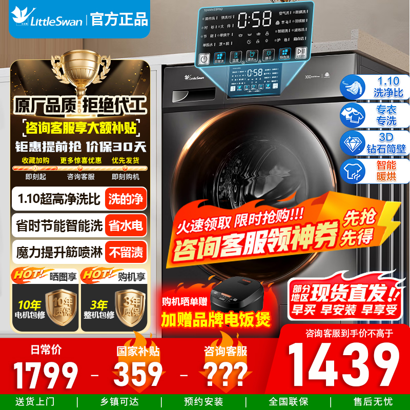 过年给父母先的一款洗衣机。之前的也是小天鹅。用了10几年啊。赶上国补。买个旋转按钮简单操作。容量10公斤实实在在。十几年前小天鹅当年也是我和父亲一起挑选。的。现在轮到我给他们挑选了。一个家电承载了许多家务。希望在用个十多年吧