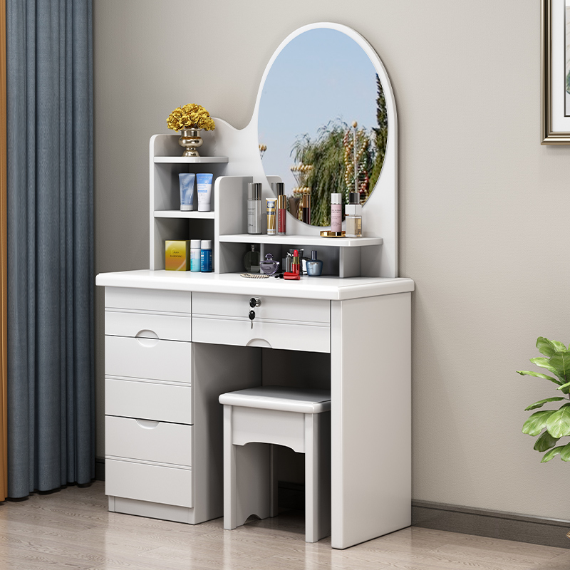 青木川 实木梳妆台化妆桌主卧室房间小户型家用带锁凳子组合套装90厘米迷你影楼成人收纳储物柜一体靠墙 白色
