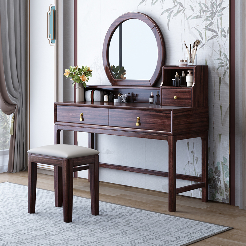 青木川 简约现代新中式实木梳妆台斗柜一体二合一卧室乌金木小户型结婚床头收纳柜化妆桌成人 1米长化妆桌+三斗柜+妆凳