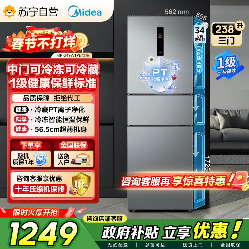 [自营]美的冰箱(Midea)238升三门冰箱灰色小型风冷家用变频一级能效宿舍租房冰箱MR-249WTPE钛钢灰-星烁