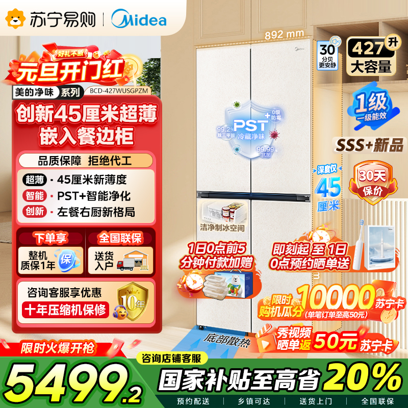 [自营]美的冰箱(Midea)45cm超薄嵌入餐边柜家用客厅大容量底部散热十字四开门BCD-427WUSGPZM 月光米
